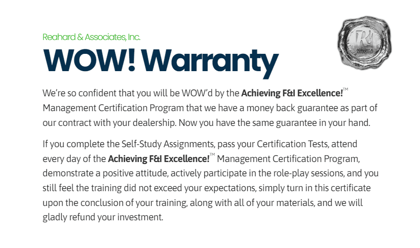 The Achieving F&I Excellence!™ Management Certification Program is an intensive finance and insurance training program, designed to provide F&I managers with the consultative selling skills necessary to maximize every profit opportunity in the F&I office, as well as enhance the customer’s F&I experience.